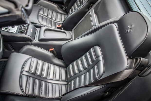 Interior: Luxurious black leather interior with carbon fiber accents, Daytona-style seats, and bespoke Ferrari badging.