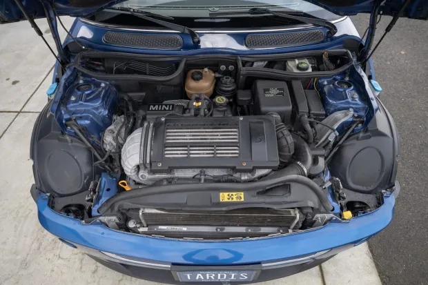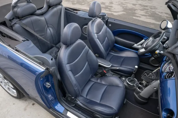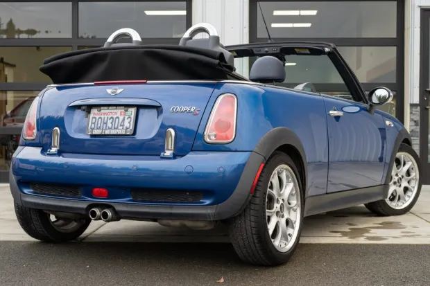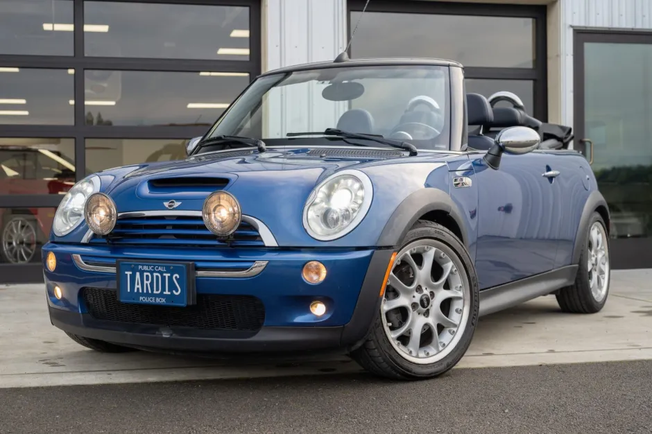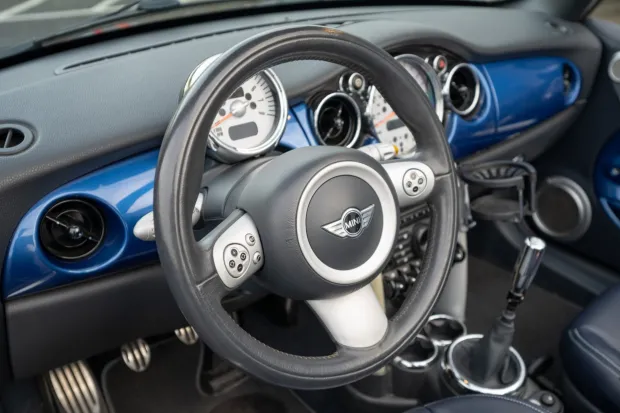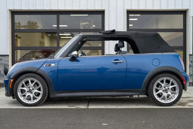 This 2007 Mini Cooper S convertible is powered by a supercharged 1.6-liter inline-four paired with a six-speed manual transaxle and is finished in Lightning Blue over Dark Blue leather. The car is equipped with a black soft top, 17″ R98 web-spoke alloy wheels, drilled and slotted front brake rotors, driving lights, Park Distance Control, heated front seats, a CD stereo, a Harman Kardon sound system, and air conditioning.